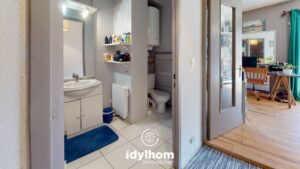 Il dispose d’une entrée avec placard, d’un séjour avec une cuisine aménagée ouvrant sur un balcon de 8 m2 exposé SUD, d’un coin nuit séparé par une porte coulissante, d’une salle de bains avec WC et d’une cave privative.