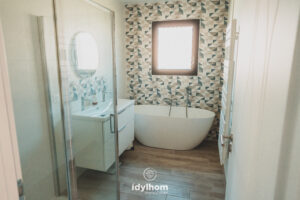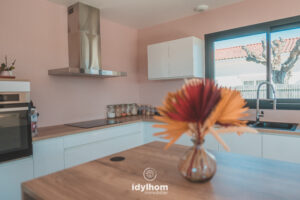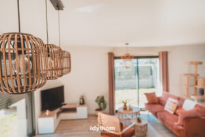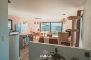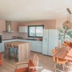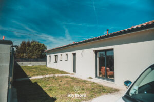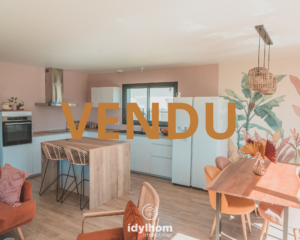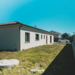 De plain-pied, elle dispose d’une entrée avec un cellier, d’une cuisine ouverte meublée et équipée avec ilot central, d’un séjour ouvrant sur une terrasse, de deux chambres, d’une chambre parentale avec dressing, d’un grand dégagement avec placard pouvant faire office de bureau ou de coin de lecture, d’une salle de bains avec une baignoire ilot et une douche à l’italienne et d’un WC séparé.