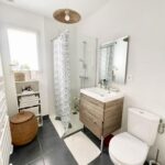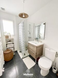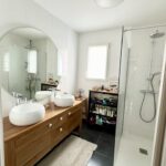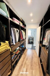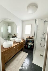 – d’un coté la suite parentale avec un dressing, une salle d’eau avec douche à l’italienne et double vasque et un WC séparé ;